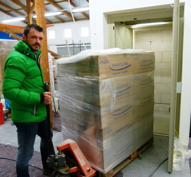 Haarbach. Bis zu 100 Paletten Ware kann Rainer Höng, Inhaber von Höng Papier und Verpackungen, in seinen neuen Räumlichkeiten in der Ortenburgerstraße in Haarbach stapeln. Platz, der dringend benötigt wird, denn die bisherigen Firmenräume des seit 2002 bestehenden Unternehmens waren viel zu klein geworden. Um die schwere Last der Paletten effektiv, sicher und schnell von einem Stockwerk in das andere transportieren zu können, entschied sich Rainer Höng für den Einbau eines Lastenaufzugs.